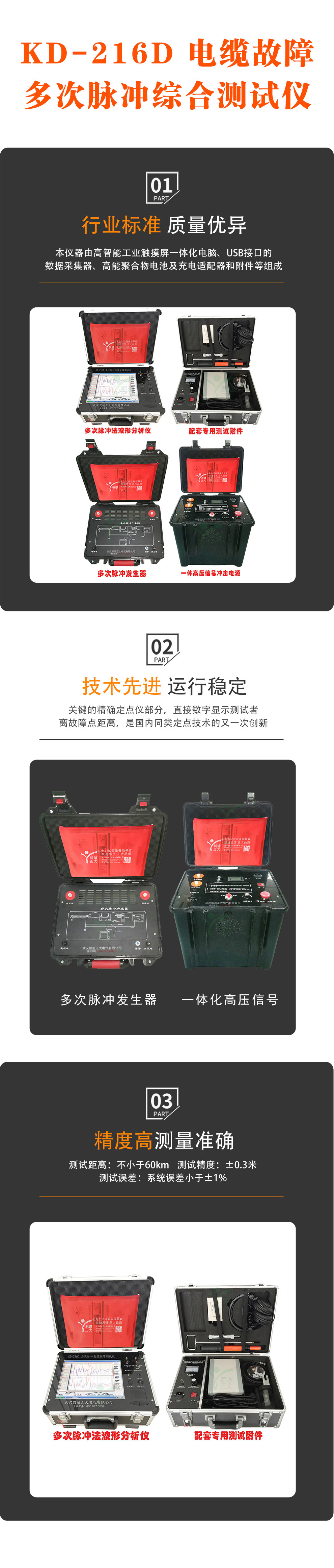 KD-216D電纜故障多次脈沖綜合測試儀是迎合工業級電力行業方案和IT時代的快速發展,將原來電纜故障測試儀的局限性,用工控嵌入式計算機平臺系統、網絡服務業務、USB通信技術系統化,很大提高了儀器的使用功能和利用價值以及便捷的現場環境操作。特別對于日益增多的地埋電纜資料提供了一套少有的管理軟件。整套系統滿足中華人民共和國電力行業標準《DL/T849.1~DL/T849.3-2004》電力設備專用測試儀器通用技術條件,該系統測試由系統主機和故障定位儀以及電纜路徑儀三部分組成,用于電力電纜各類故障的測試,電纜路徑、電纜埋設深度的尋測和電纜檔案資料的日常維護管理,以及鐵路、機場信號控制電纜、和路燈電纜故障的精確測試。