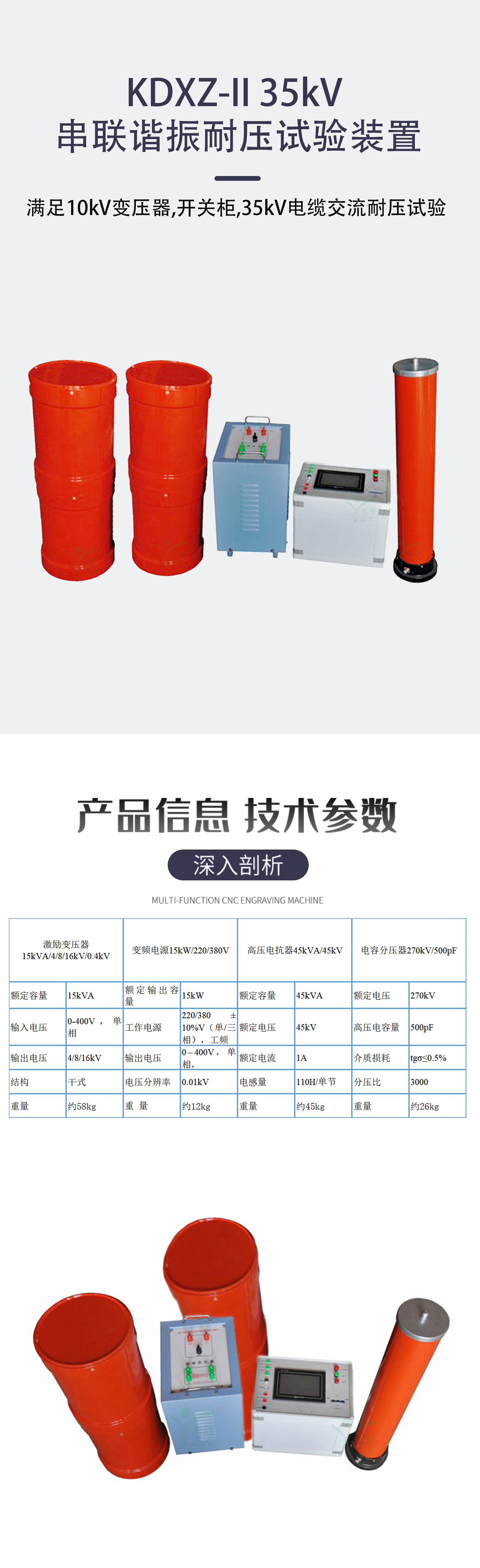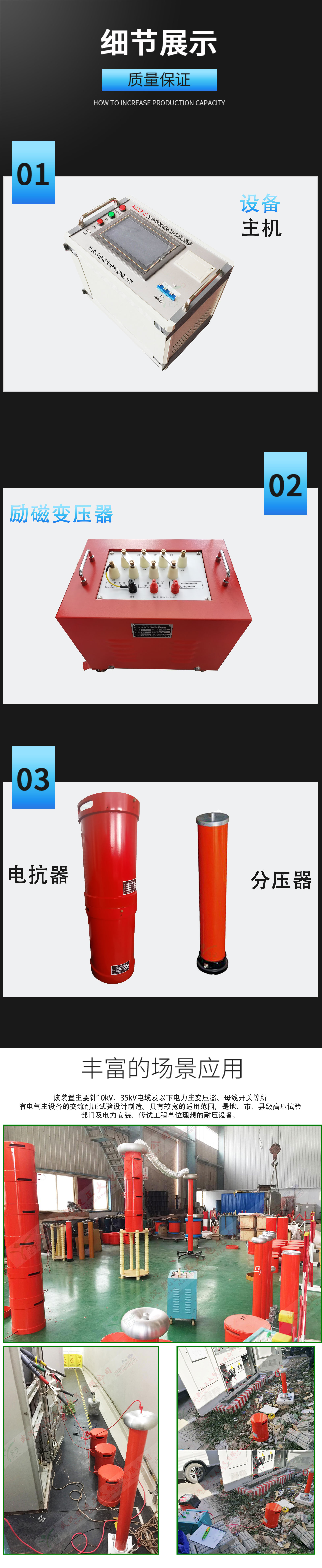 適用于高電壓、大容量的電力設備,如發電機、大型變壓器、GIS、交聯聚乙烯電力電纜、高壓開關、互感器等的交流耐壓試驗。
