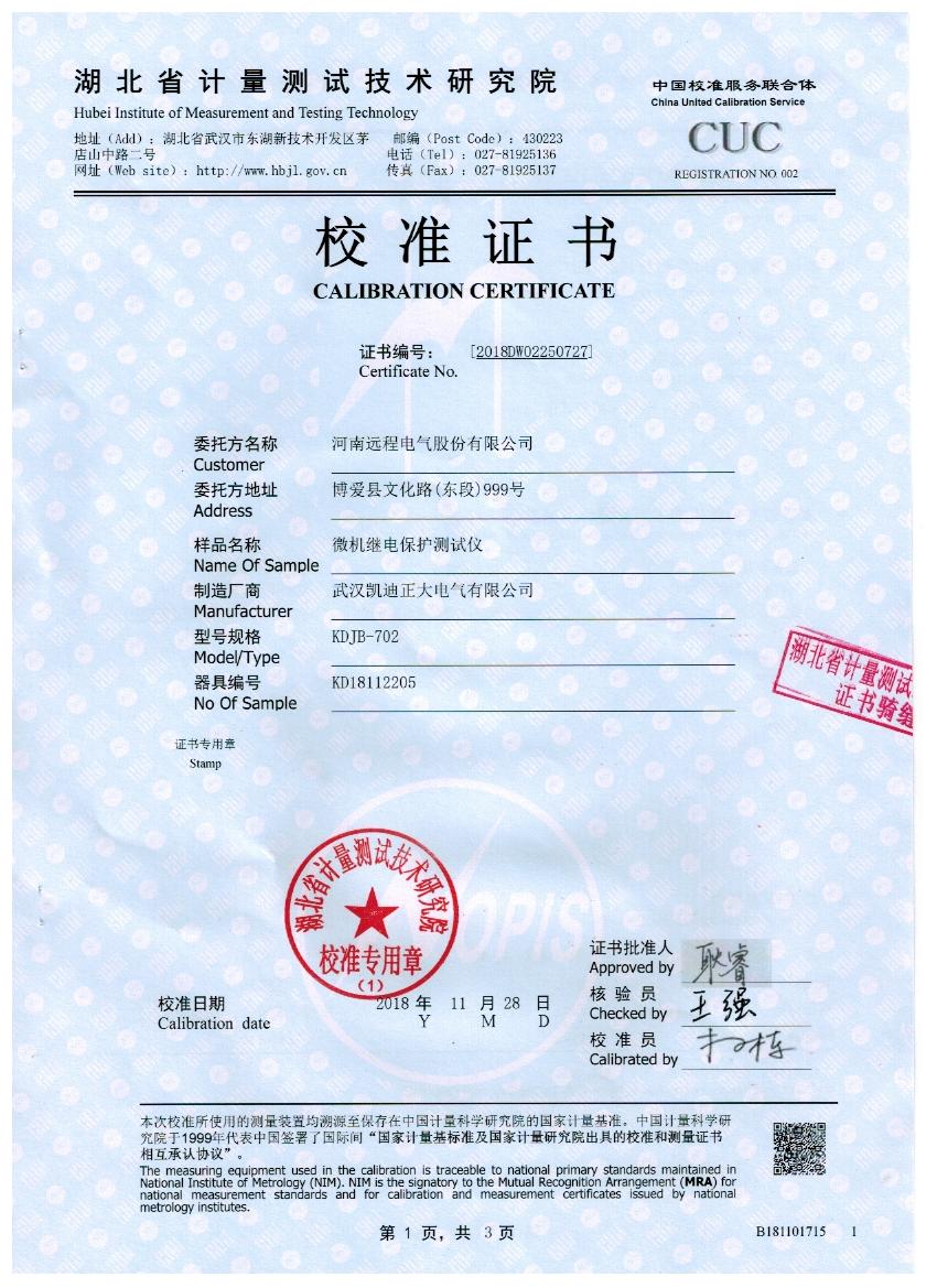 湖北省計量測試技術(shù)研究院是政府計量行政管理部門依法設(shè)立的法定計量檢定機構(gòu),本次校準(zhǔn)的技術(shù)依據(jù)是參照J(rèn)JG 1112-2015繼電保護測試儀,校準(zhǔn)所使用的主要計量設(shè)備數(shù)字多用表,型號/編碼:8508A,校準(zhǔn)環(huán)境溫度20.2度,相對濕度40度,校準(zhǔn)數(shù)據(jù)結(jié)果符合國家電力預(yù)試設(shè)備標(biāo)準(zhǔn)。