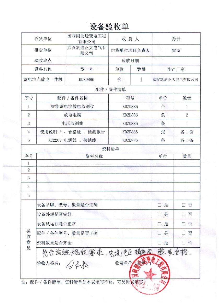 就在前幾日國網(wǎng)湖北送變工程有限公司采供了我司KDZD886蓄電池充放電一體機一套,并且驗收成功,驗收結(jié)果也達到試驗規(guī)程要求,電流電壓精度都很高,驗收結(jié)果表示很滿意!KDZD886蓄電池充放電一體機主要配件有KDZD886智能蓄電池檢測儀1臺,KDZD886放電電纜2條,KDZD886電壓檢測線1條,使用說明書,合格正,檢測報告各一份,KDZD886 AC220V電源線,接地線各一條,湖北省送變電工程公司是湖北省電力公司的合資子公司,隸屬于國家電網(wǎng)公司,是一家從事輸變電工程施工的省級專業(yè)公司,具有國家電力工程施工總承包壹級企業(yè)資質(zhì)和一級承裝(修、試)電力設(shè)施許可證;通過了國家質(zhì)量管理體系、環(huán)境管理體系和職業(yè)健康安全管理體系的認(rèn)證。現(xiàn)有職工2076人,具有中高級專業(yè)技術(shù)資格人員219人。