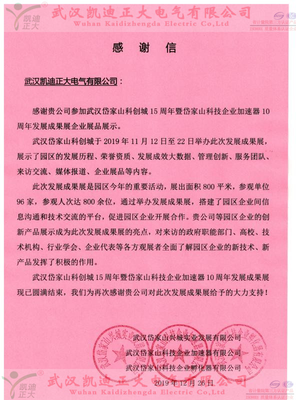 武漢凱迪正大電氣有限公司規(guī)模擴(kuò)大,應(yīng)股東大會(huì)會(huì)議決定喬遷江岸區(qū)漢黃路888號(hào)岱家山科技城4號(hào)樓3樓,在獲得江岸區(qū)岱家山企業(yè)加速器公司的大力支持,我司榮獲9類品牌商標(biāo)三項(xiàng)、軟件著作專利9項(xiàng)、實(shí)用新型專利11項(xiàng)、質(zhì)量體系認(rèn)證ISO9000、江岸區(qū)科技小巨人、國(guó)家高新技術(shù)企業(yè)等榮譽(yù),年度中標(biāo)率上升98%,年度中標(biāo)總金額超過(guò)870萬(wàn)元。這些榮譽(yù)及訂單超過(guò)了85%的同行業(yè)單位。在岱家山加速器公司的扶持下我們會(huì)做的更好??!