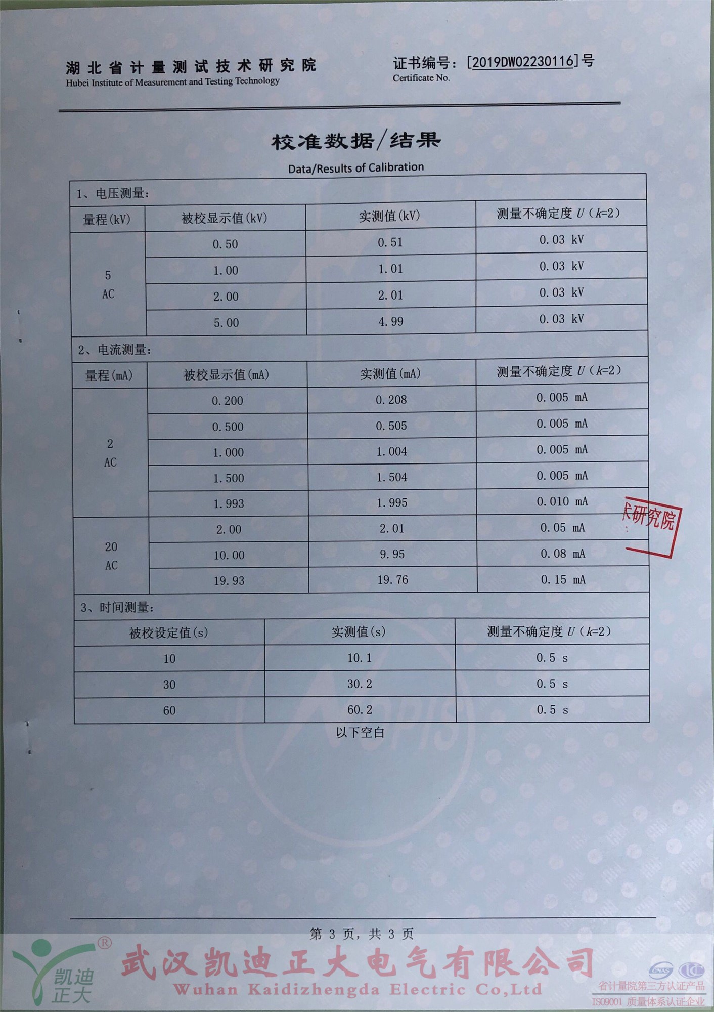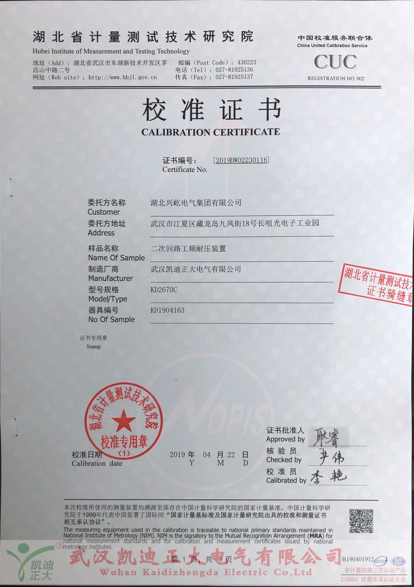 購(gòu)買后便送往中國(guó)校準(zhǔn)服務(wù)聯(lián)合體-湖北省計(jì)量測(cè)試技術(shù)研究院檢定,由省計(jì)量院出具的《校準(zhǔn)證書(shū)》,證書(shū)編號(hào):2019DW02230116,校準(zhǔn)員:李艷,檢驗(yàn)員:嚴(yán)偉,證書(shū)批準(zhǔn)人:耿睿。