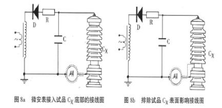 b.微安表須有金屬屏蔽,應采用屏蔽線與試品聯接。高壓引線的屏蔽引出應與儀表端的屏蔽緊密聯接。如果試品表面污穢要排除試品表面泄漏電流的影響可在試品高電位端用裸金屬軟線緊密繞幾圈后與高壓引線的屏蔽相聯接(見下圖)。