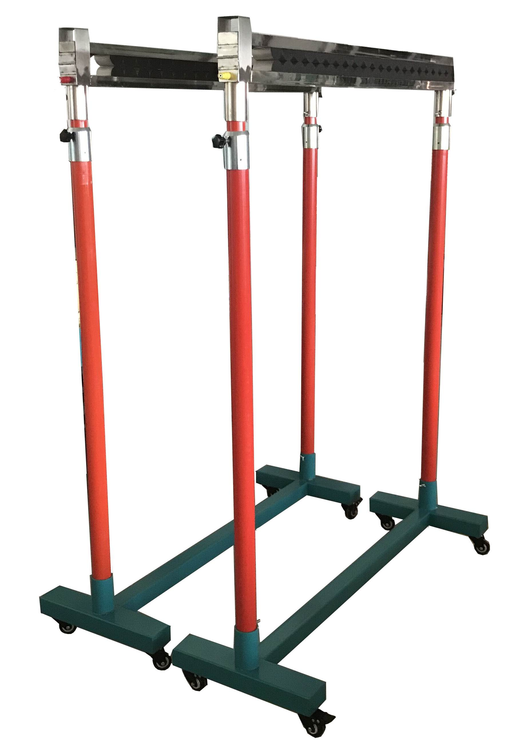 手動(dòng)升降支架采用分體式結(jié)構(gòu),可根據(jù)試品長(zhǎng)短的需求,調(diào)節(jié)支架的距離來滿足試驗(yàn)的要求,每個(gè)分體支架有大小2根絕緣管嵌套組成,第一節(jié)有效高度為1.2米,在電壓要求比較高時(shí),通過手動(dòng)拉升支架,調(diào)節(jié)支架的高度,在接頭處有安裝緊固旋鈕,當(dāng)支架升到合適的位置時(shí),旋轉(zhuǎn)固定旋鈕將第二節(jié)固定。