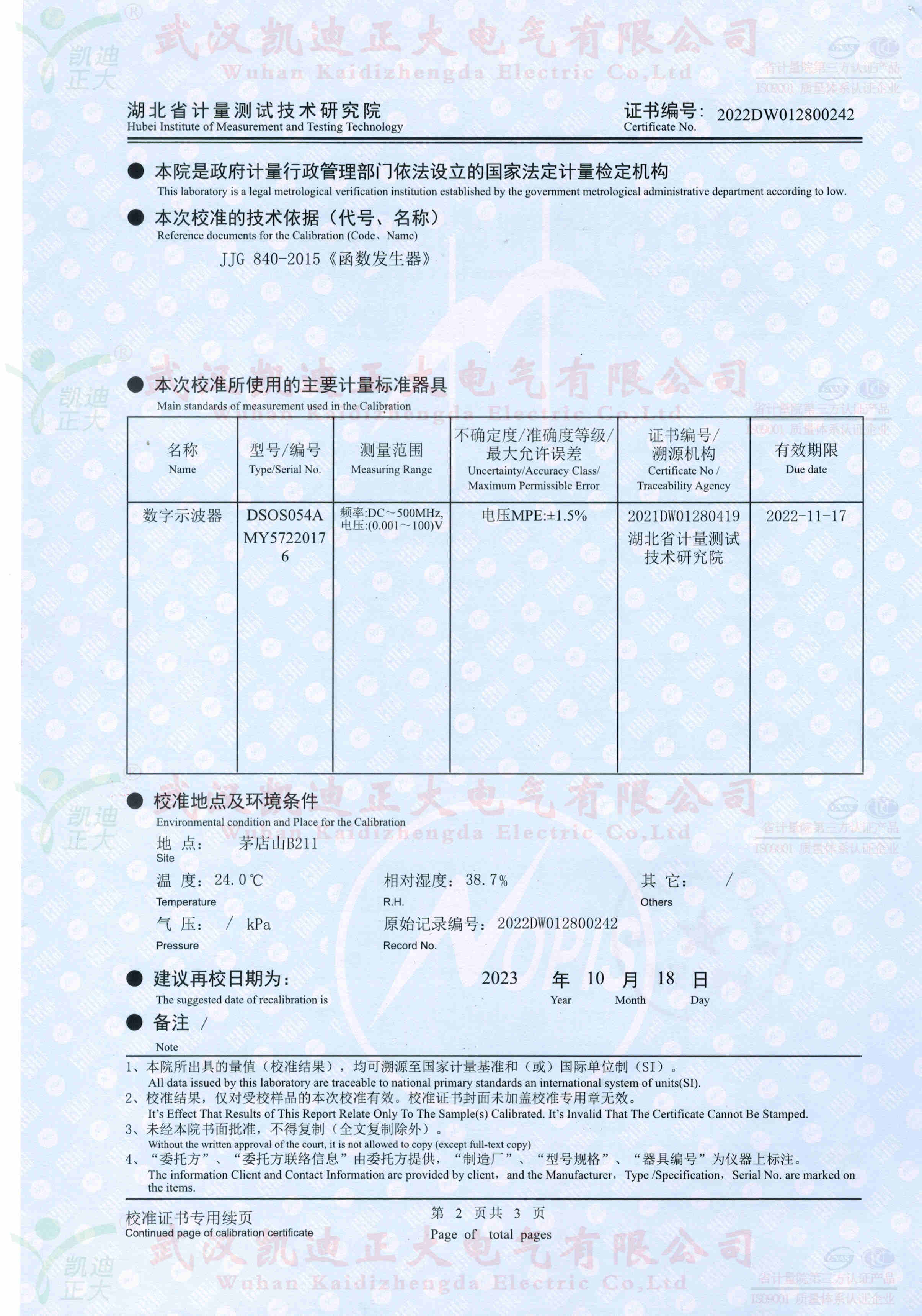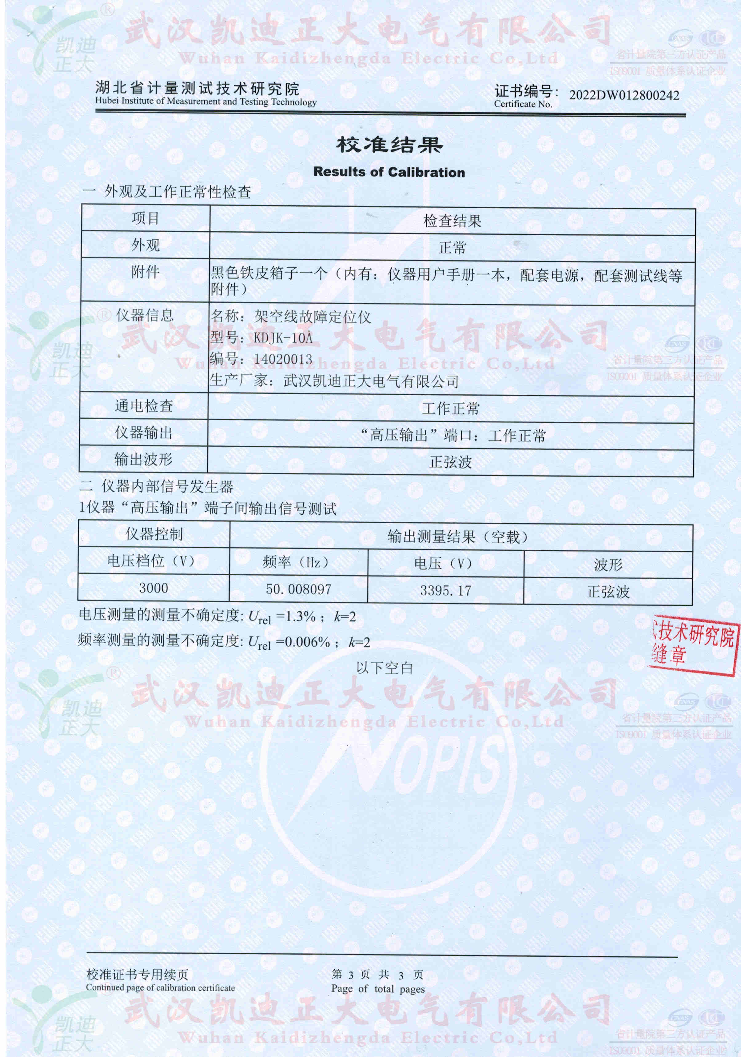 KDJK-10A故障檢測儀特性及技術(shù)參數(shù)獲得湖北省計量測試技術(shù)研究院的校準證書,設(shè)備為電力工業(yè)電氣設(shè)備質(zhì)量檢驗測試中心的要求。計量設(shè)備的高壓測試輸出的電壓、波形正玄波、電壓檔位的選擇。