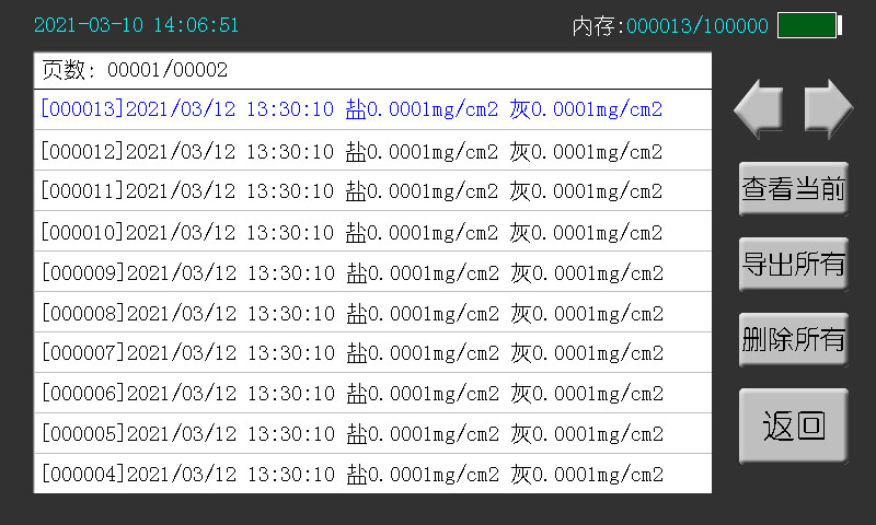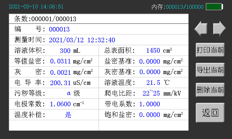 鹽密基準(zhǔn)值:在測量頁點(diǎn)“校準(zhǔn)”按鈕后會自動保存溶液的初始鹽密值作為“鹽密基準(zhǔn)值”,也可以用戶自定義。