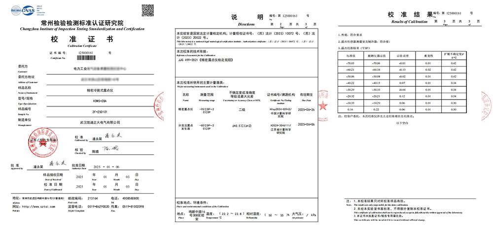 2025年1月3日,武漢凱迪正大電氣有限公司的KDWS-28A精密冷鏡式露點儀,成功通過了常州檢驗檢測標準認證研究院的嚴格校準,并榮獲校準證書,標志著該產品在工業氣體微水測量的可靠和精準性。