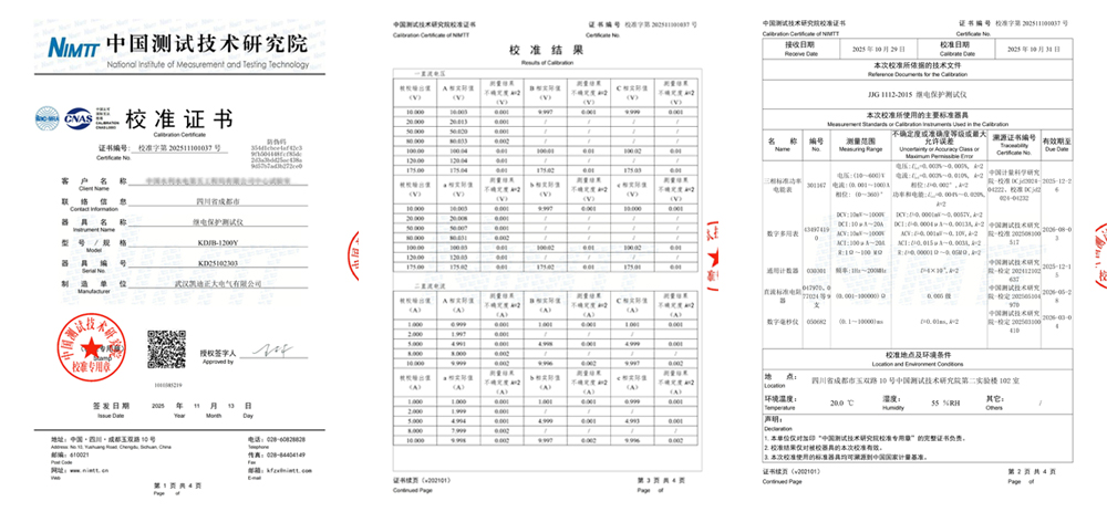 在電力系統安全穩定運行中,繼電保護裝置扮演著“安全衛士”的角色,而其性能的可靠性則直接依賴于精準的測試與校驗。近日,武漢凱迪正大電氣有限公司成功向中國水利水電某工程局試驗室交付了KDJB-1200Y 繼電保護測試儀(出廠編號:KD25102303)。為確保儀器量值的準確可靠,該設備已送至國家權威計量機構——中國測試技術研究院(NIMTT) 進行了全面、嚴格的校準,并順利獲得校準證書(證書編號:校準字第202511101037號)。這標志著該儀器在電氣輸出、時間測量等關鍵性能指標上均符合國家計量規范要求。